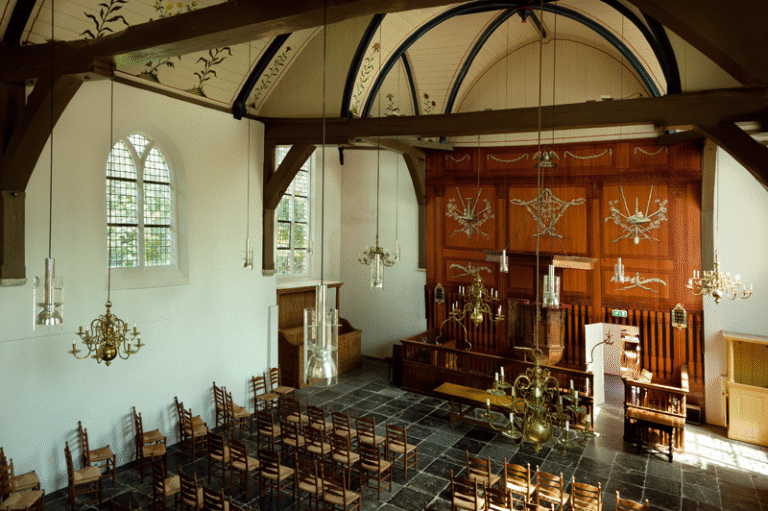 Het dorpskerkje bevat een originele raadzaal en een kerkzaal waar burgerlijke huwelijken in stijl kunnen worden gesloten. De gewelven in de kerk zijn feestelijk versierd met motieven van veldbloemen. Ook de raadzaal is met bloemen en de ‘Boom des levens’ getooid.